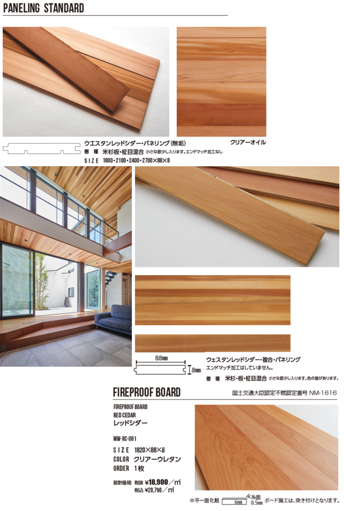 無垢ウェスタンレッドシダー 複合ウェスタンレッドシダーパネリング 不燃ファイヤープルーフボードレッドシダー(室内と軒天)